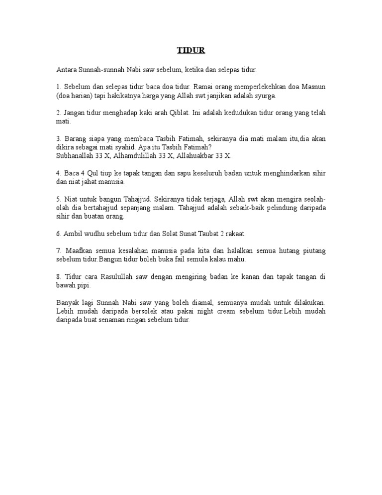Ketika rasa kantuk datang menyerang biasanya seseorang akan segera pergi tidur. Selanjutnya kata nabi bacalah allahu akbar 34x alhamdulillah 33x dan subhanalloh 33x sebelum tidur dan sesudah salat amalan hadiah dari nabi kepada putrinya ini selanjutnya dikenal sebagai tasbih fatimah az zahra. Doa sebelum tidur ini merupakan amalan doa dan dzikir sebelum tidur dalam islam yang sesuai dengan sunnah rasulullah shallallahu alaihi wa sallam.